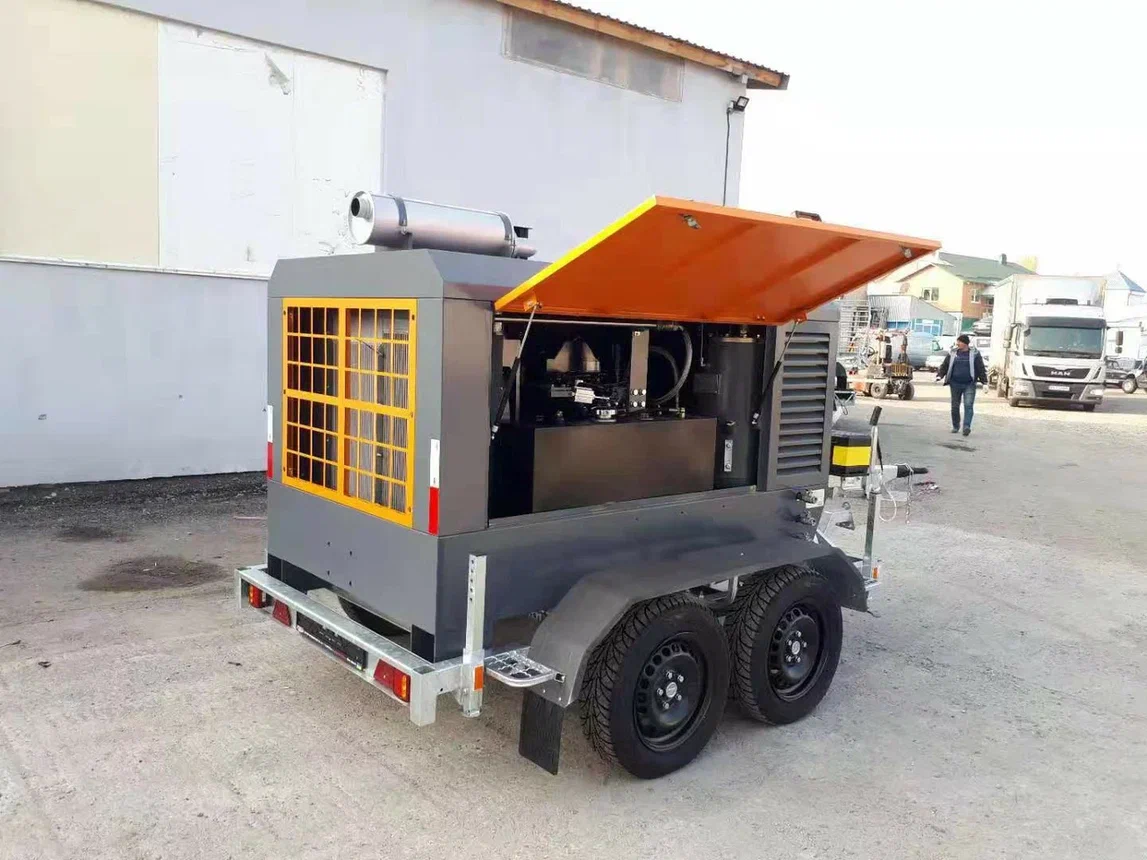 Компрессор с производительностью 7.5 м3/мин. легко передвигаемый между объектами с помощью шасси.